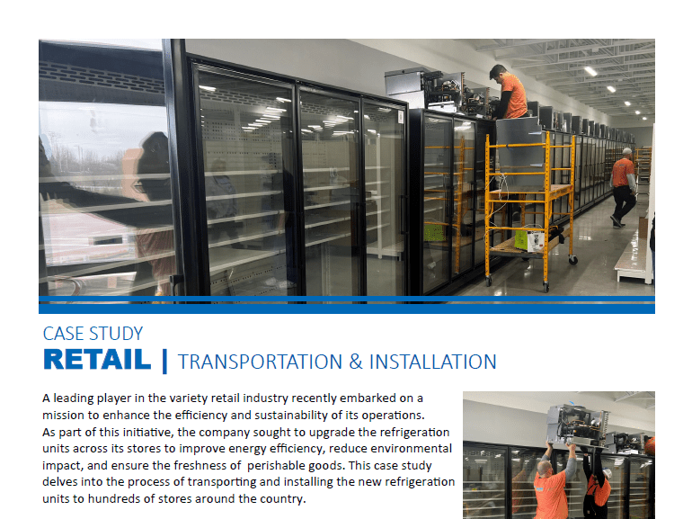 This case study highlights how our team supported a national variety retailer in upgrading refrigeration units across hundreds of store locations. Our team coordinated the transportation and installation of the new equipment, ensuring each unit arrived safely and was installed efficiently to keep store operations running smoothly.