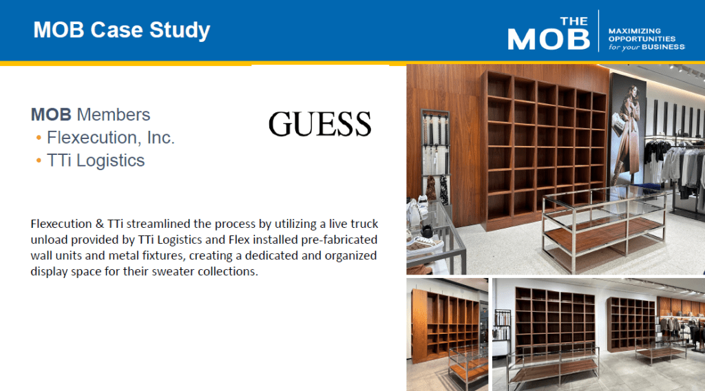 TTi Logistics utilized a live truck unloading process alongside the install of pre-fabricated wall units and metal fixtures, to create a dedicated and organized display space for GUESS’s sweater collections.