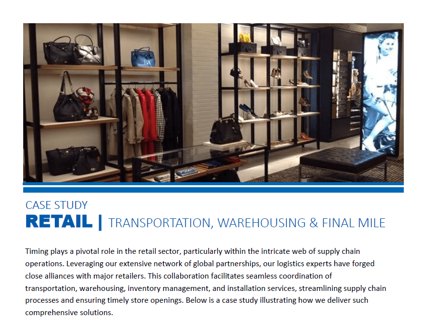 This case study highlights how we supported a leading global designer brand during a major growth phase by managing critical elements of their retail supply chain. By coordinating transportation, warehousing, inventory management, and final-mile delivery, our team helped ensure store assets moved seamlessly through the supply chain and arrived on time for new store openings.